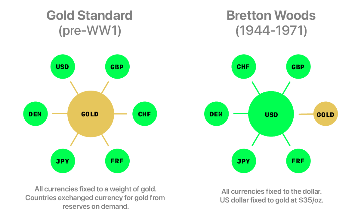 After the second war, another conference was convened to rebuild the system. The Bretton Woods system placed the U.S. dollar at the centre of global finance. Other currencies orbited the dollar at fixed exchange rates.